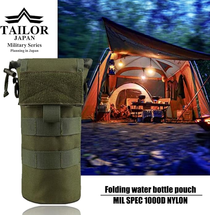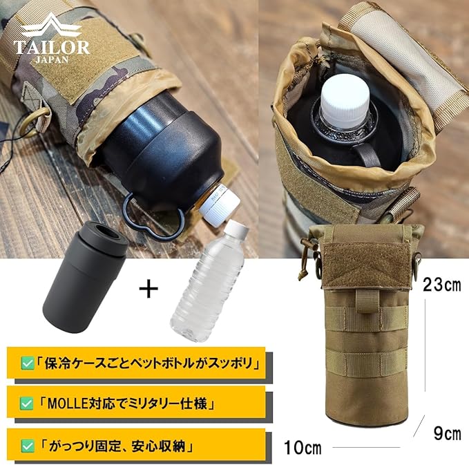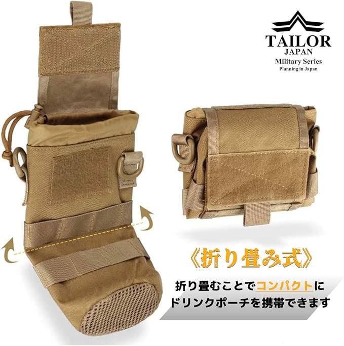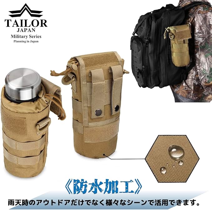 【仕様】水筒サイズに適した大き目モデル。MOLLE対応で他の大容量のバックパックやベルトなどに取り付けることができ、ラクに持ち運びが可能。
