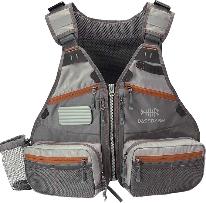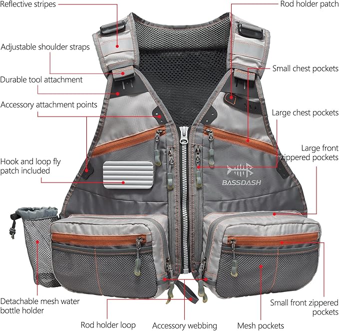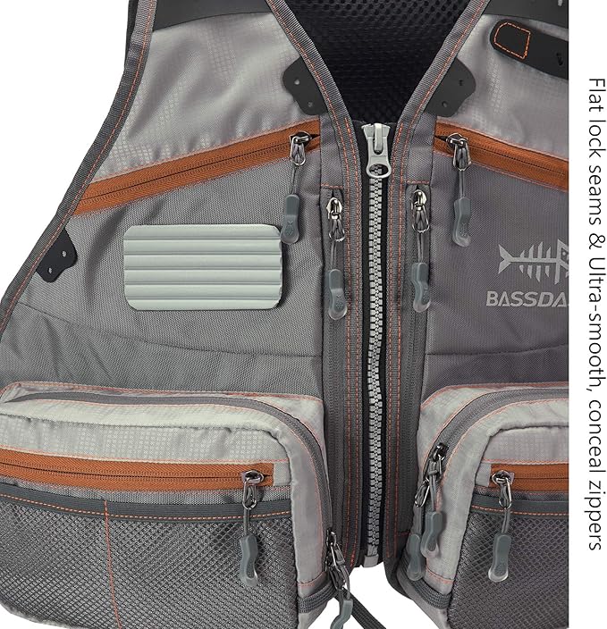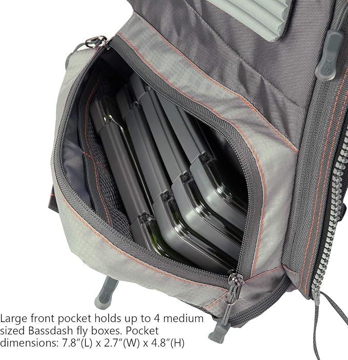 大容量:18ポケットデザイン、フロントポケットは渓流釣りに4個BASSDASHフライケースが収納可能。