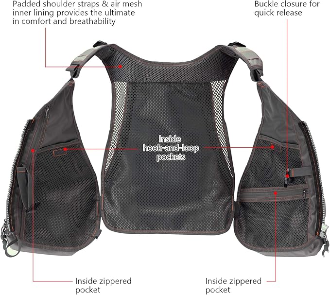 バックと肩部分に分厚いクッション材入り、肩の負担を大幅軽減します。ベストのバックと裏地はメッシュ素材を採用されて、通気性良い。