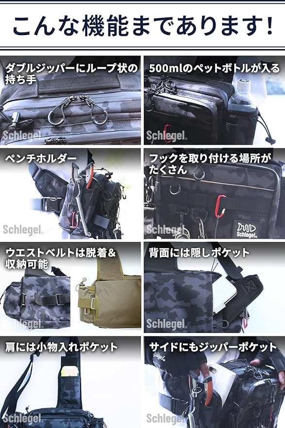 【多機能】ループ状のダブルジッパーは開け閉めし易く、ウエストベルトは着脱出来て、背中に収納可能。フックが取り付けられるフロント部分に、プライヤーホルダー、簡易ロッドホルダー、サイドジッパーポケット、ペットボトルホルダー、肩の小物入れポケット、背面には隠しジッパーポケットも。