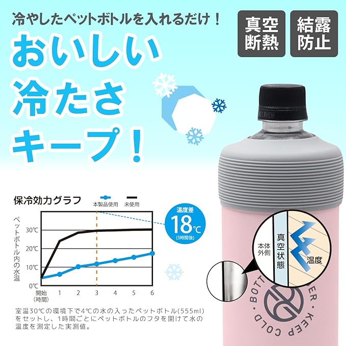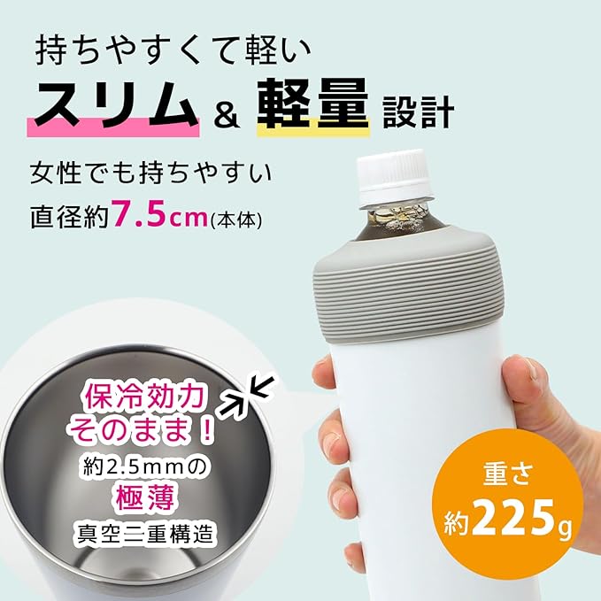 ■商品サイズ(フタ装着時):約φ8.1 h17.1cm/重量約225g (ホルダー本体のみ):約φ7.5 h16.9cm/容量約600ml(満水) ■生産国:生地=中国、絵付加工=日本 ●真空断熱二重構造で冷たさ長持ち! ●結露しないからカバンの中やデスクでも安心して使えます。 ●耐久性・耐錆性に優れた18-8ステンレス素材を使用。 ●本体直径約7.5cmのスリムボディで女性でも持ちやすく、車のドリンクホルダーにも入ります。 ※ホルダーの形状によっては対応していない車種もあります。 ●滑り止め加工が施されたシリコーン蓋でキャップの開閉時にペットボトル本体が回転しにくくなっています。 ●シリコン蓋の着け外しが簡単にできます。 ●500~600mlのペットボトルに対応しています。 ●シリコン蓋を外せば直飲みタンブラーとしてハイボールやカクテル、ビールなどにもお使いいただけます。 ●アウトドア、スポーツ、オフィス、ドライブ、家呑みなど様々なシーンで活躍してくれます。