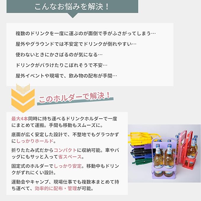 【持ち運びに便利なドリンクホルダー】 スポーツイベントや屋外活動、建設現場などで活躍する多機能ドリンクホルダー。ペットボトルや紙コップを最大4本まで同時に運ぶことができ、取っ手付きで移動もスムーズ。手がふさがらず、複数人分のドリンクを一度に持ち運べる便利なアイテムです。