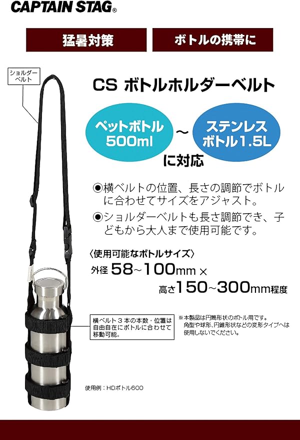 製品サイズ:(約)ベルト幅25mm 長さ800~1300mm(使用するボトルの外径などにより異なります。)、使用可能なボトルサイズ:(約)外径58~100mm 高さ150~300mm程度