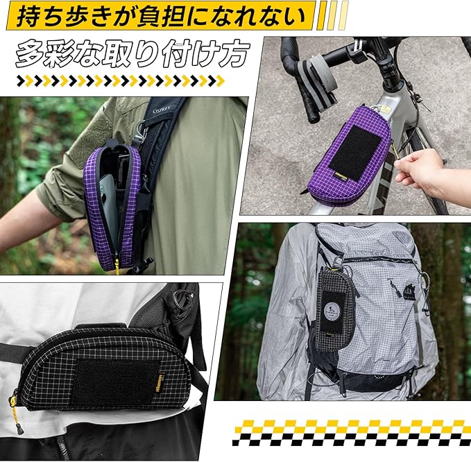 「負担にならない取り付け方」:重さ僅か75gしかない、負担にならない軽量リュックポーチです。ウエストポーチとして使ったり、自転車に取り付けて使ったりすることもできます。使用場面によって変えられて 登山だけでなく、サイクリング、日常などいろんなシーンで大活躍できる。
