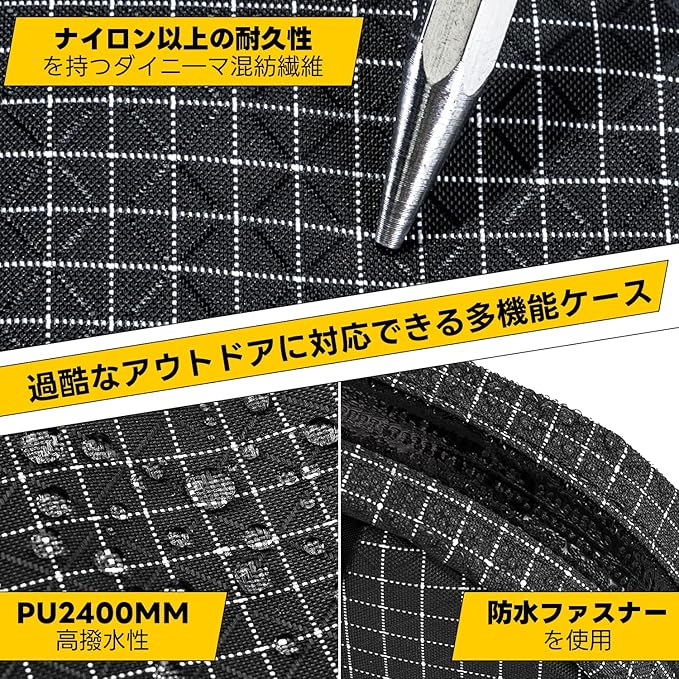 「ダイニ―マ混紡&高撥水性生地」:ナイロンよりも引き裂けに強いダイニ―マ混紡を使用、PU2400MMの高撥水性を達成、さらに止水ジッパーを使用したところで、急な小雨でも対応できるリュックポーチです。