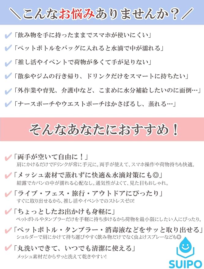 重量: たった約90gの超軽量設計!斜めがけしても肩が疲れにくく、散歩・ウォーキング・農作業・通勤通学など長時間の使用でも快適。旅行や自転車移動にも最適。