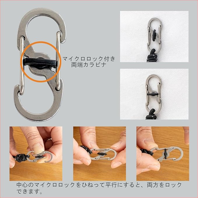 S字の両端カラビナは幅が約1.5cmと、小さく細めです。マイクロロック付きで、外れにくくなっています。