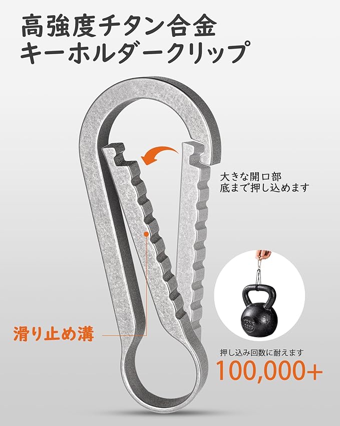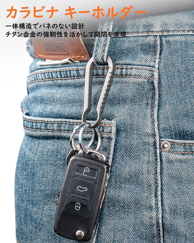 チタン キーホルダー : 当社のカラビナフックは高品質のチタン合金で作られています。チタン合金は軽くて丈夫なだけでなく、耐食性にも優れており、汗や海水などの浸食を受けても錆びにくいです。この素材は特に屋外での使用に適しており、さまざまな過酷な環境条件に耐えることができます。