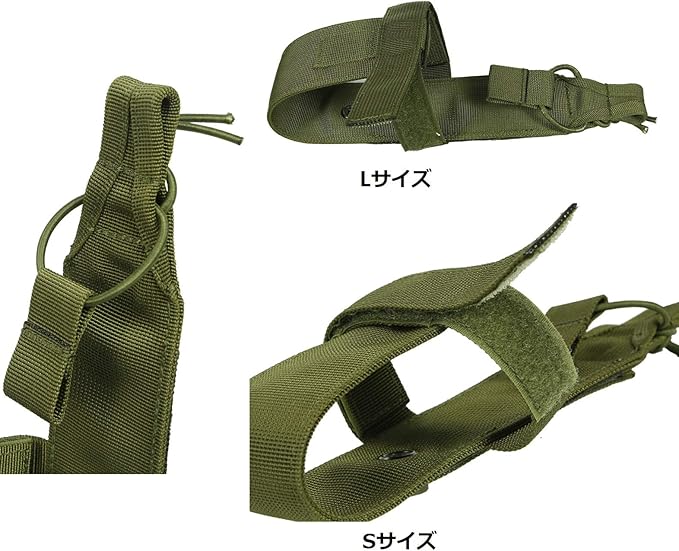 デザイン:背面にモールストラップ付きで、モール対応したバックパック、ベルト、ベストに取り付ける可能で、持ち運びには手軽です。マジックテープ式のベルトがサイズに合わせて調整可能です、いろんな直径のペットボトルや水筒が対応できます。上端のゴムバンドは自由に結束でき、安定感があります。