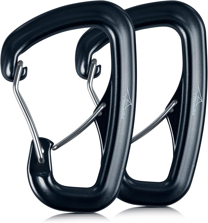 「ユニークなデザイン」:Travel Birdのアップグレードされたダブルドアカラビナは、強力な弾性スチールワイヤードアを備えており、片手で簡単に操作できます。安定した閉鎖により、ウェビングがしっかりと固定され、多目的設計により、より多くのアイテムを運ぶことができます