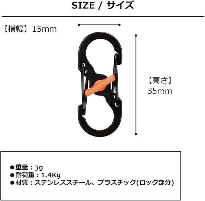 【サイズ】:H35 W15 D1.5mm 重量:3g 材質:3Cr13ステンレス 耐荷重:1.4kg ※注意点:クライミング用のカラビナとして使用することは危険ですのでお止め下さい。