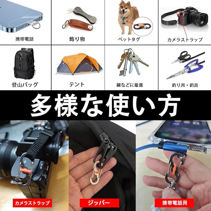 【幅広く使える】キーを吊るしたり、バックパックを掛けたり、ケトル、バックパックなどを吊るしたりするのに適しています。登山、アウトドア、キャンプ、釣り、普段のおしゃれとして、ポーチやボトルを吊り下げたりすることがとても便利で不可欠なものです。
