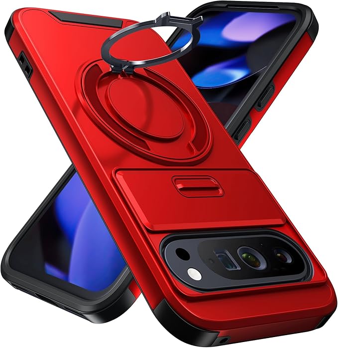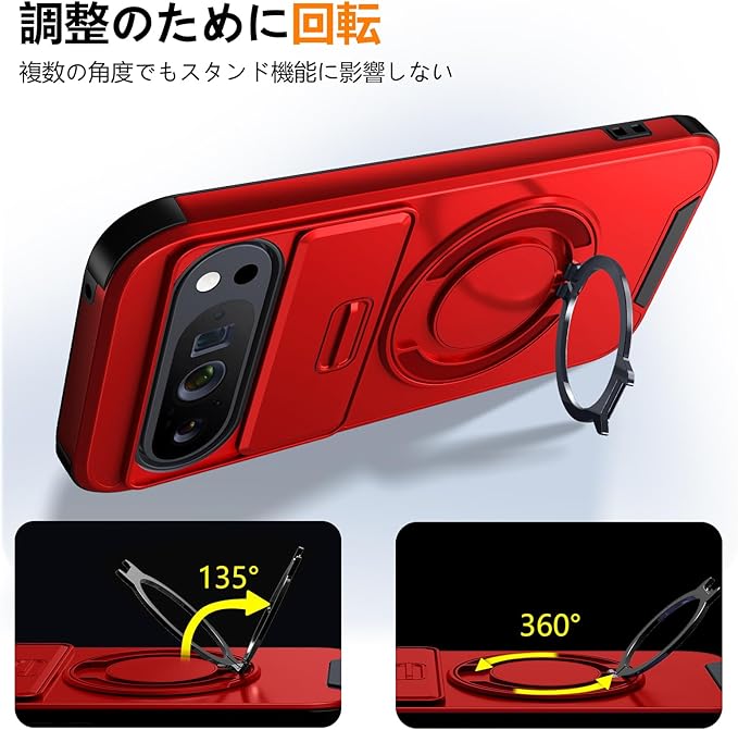 Google Pixel 10 Pro XL 用 ケース リング付き スライド式カメラカバー 隠しスタンド 耐衝撃 スタンド機能 縦横両対応 車載ホルダー PC TPUバンパー 防塵 人気 落下防止 滑り止め 指紋防止 ピクセル 10 プロ XL カバー 赤 MJJ-1065-10-03