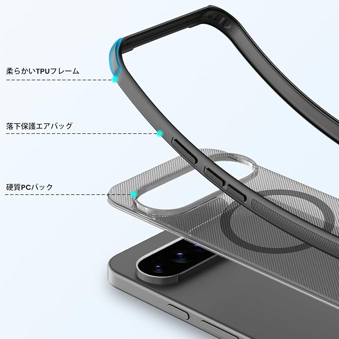 【二重保護・エアクッション構造】柔軟なTPUフレームと硬質PC背面パネルの二重構造でしっかり保護。四隅には衝撃を吸収するエアクッションを搭載し、落下時のダメージを効果的に軽減します。