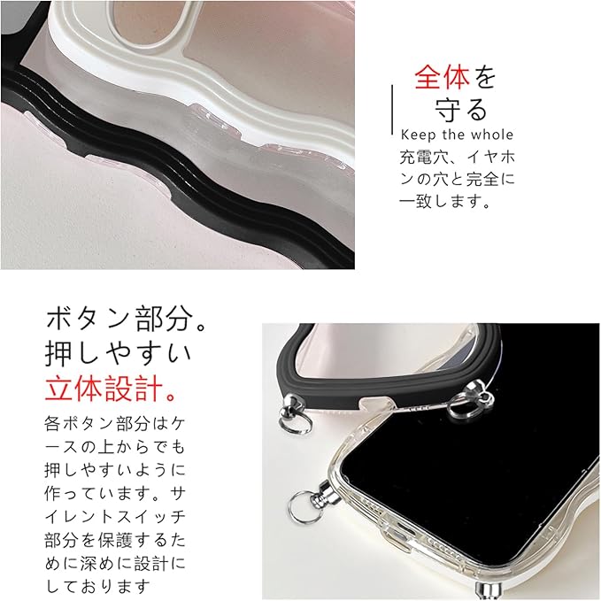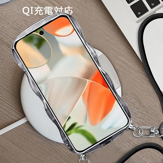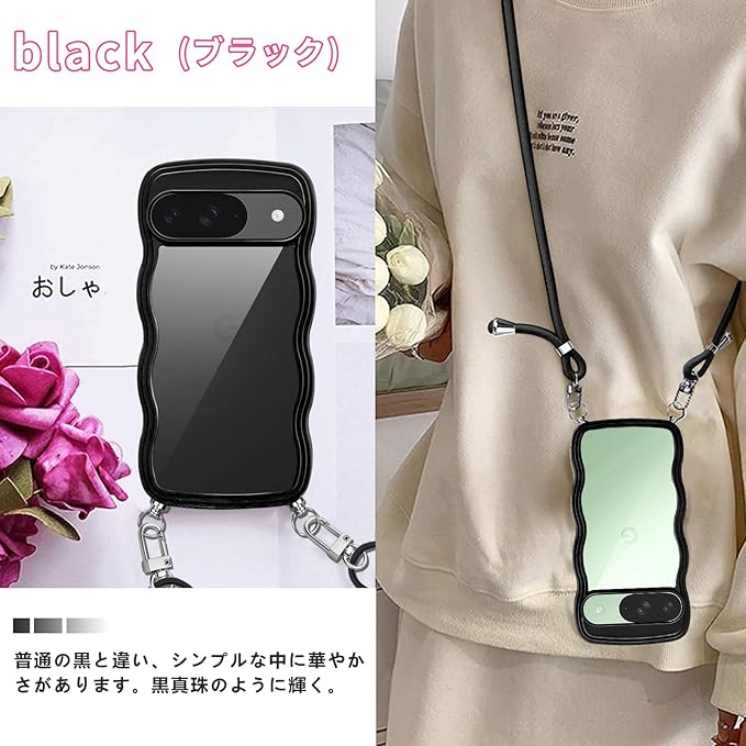 Google pixel10 /pixel 10 pro 用の ケース ショルダー クリア なみなみ TPU ピクセル10/10pro スマホケース カバー 創意 個性 肩掛け 首掛け 斜めかけケース 可愛い かわいい 韓国 透明 耐衝撃(ブラック) | KAZESHOP