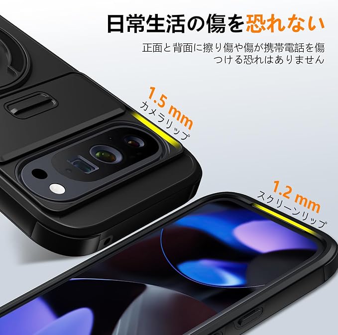 【耐衝撃性抜群】優れた衝撃吸収性を誇る素材と構造が、誤って落とした際の衝撃を効果的に軽減します;スマートフォンの画面やカメラレンズの落下による損傷を防ぐために、レンズやエッジよりもわずかに高いデザインを採用し、デザインにも細部まで徹底的なこだわりを持ち、大切な新しい愛機を傷や破損から守り抜きます