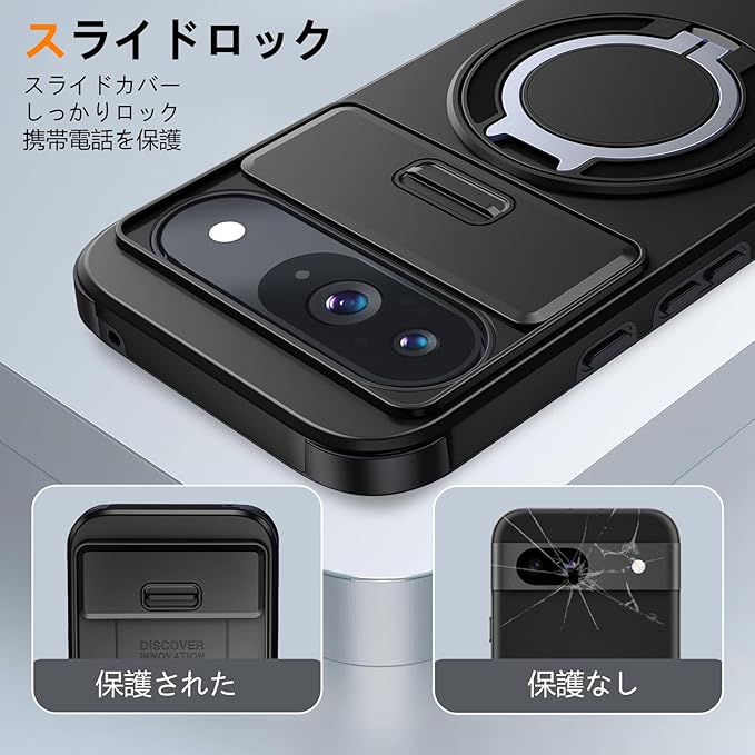 Google Pixel 10 用 ケース Pixel 10 Pro 用 ケース リング付き スライド式カメラカバー 隠しスタンド 耐衝撃 スタンド機能 縦横両対応 車載ホルダー PC TPUバンパー 防塵 人気 落下防止 滑り止め 指紋防止 ピクセル 10/ピクセル 10 Pro カバー 黒 MJJ-1065-09-01 | KAZESHOP