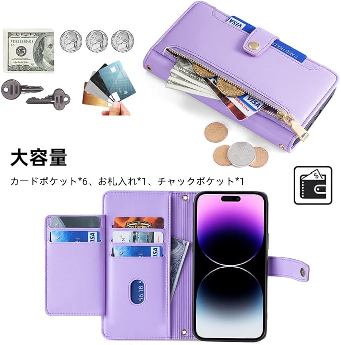 【収納力抜群】: カードポケットが5個収納可能、サイドポケットが1個、チャックポケット1個、内側に2つのカードスロット、名刺、収納、外側にカードや小銭を収納できるジップ付き小銭入れを装備し、大切なカードなどを守ります。美観と実用性を兼ね備えた、とても便利でスタイリッシュなウォレットケースです。