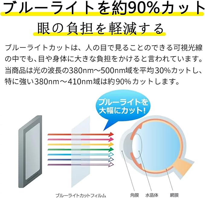 【特別なご案内】:ブルーライトカット処理が施されているため、室内の光ではブルーライトフィルムの色が見えにくくなっています。日光の下では、色がより明確に見えることがありますが、使用角度や環境によって、フィルムが淡い青色や薄い黄色に見えることがあります。何卒ご了承ください