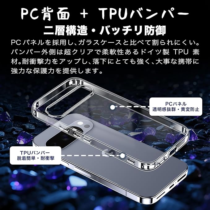 【対応機種】Google Pixel 10 Pro XL ケース に適応しています。他のデバイスには対応しておりませんので、ご注文の際はご注意ください。ケース驚きほどの透明感、美しさをしっかりキープ、Phone本体のカラーを活かせて。