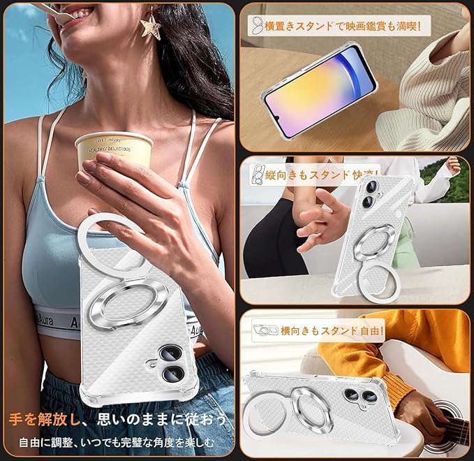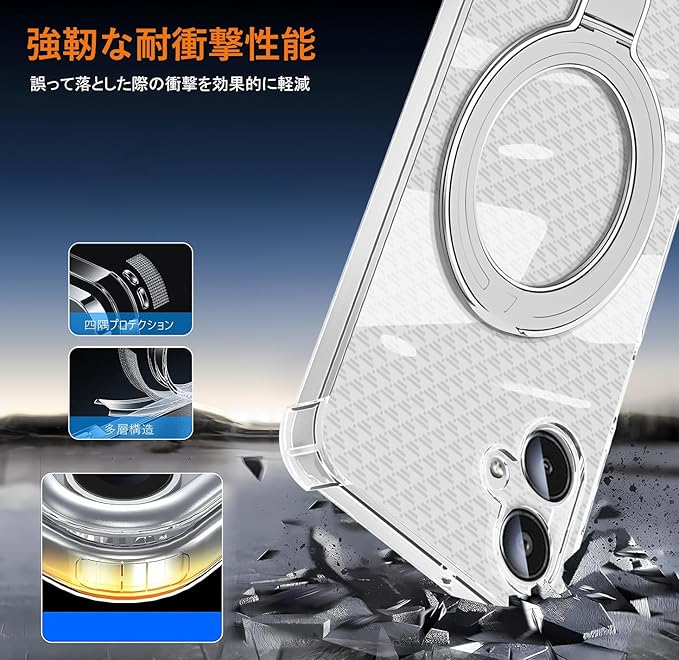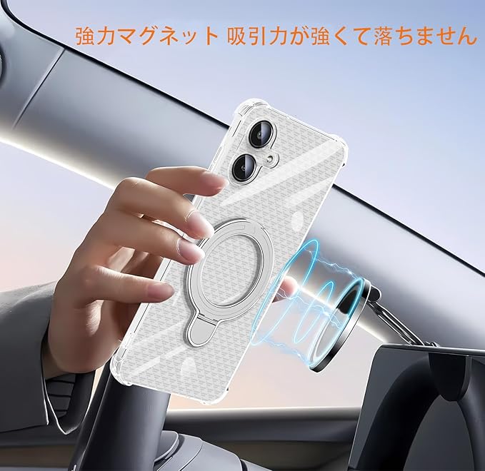 【ホルダー機能&車載磁気吸引機能】リング付き 0-120度反転可能。 多機能スタンドとリング一体型の斬新なデザインです。隠しスタンドの設計で、省スペース性に優れ、収納するときは水平的に置けできて、持ち運びの邪魔になりません。縦置きでも横置きでも安定して支えられ。FaceTimeでも動画でも両手が完全に解放されます。また、安定したアルミ合金製の円形スタンドを採用しており、携帯性からもファッション性からも唯一無二の存在です。磁気吸引機能は車載スタンドに吸着することもでき、ナビゲーション、ハンズフリー通話などさまざまなシーンで使用でき、運転時に便利