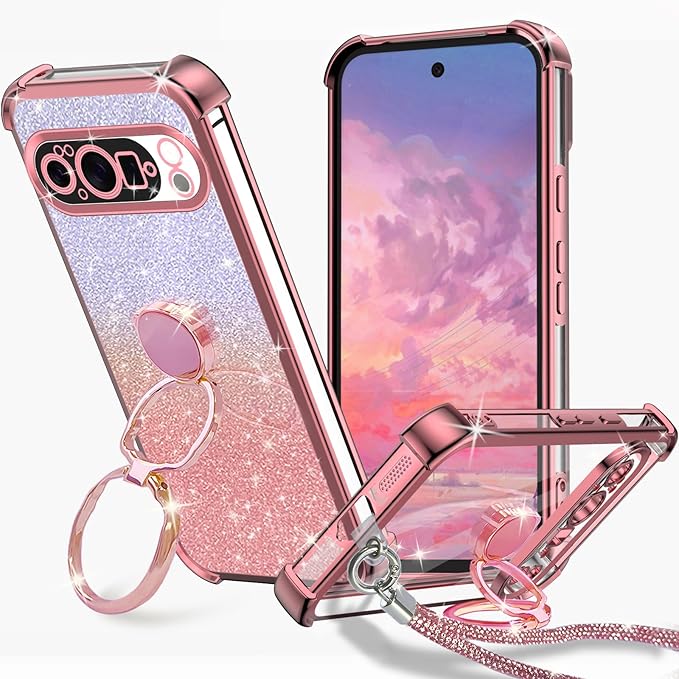 KAJICOO Google Pixel 10 Pro ケース ダブルリング付き グリッターカード&リストストラップ ピクセル10 プロ カバー 軽量薄型 キラキラ デザイン可愛い おしゃれ 女子向け レンズ保護 Pixel 10 Pro スマホケース - ゴールド