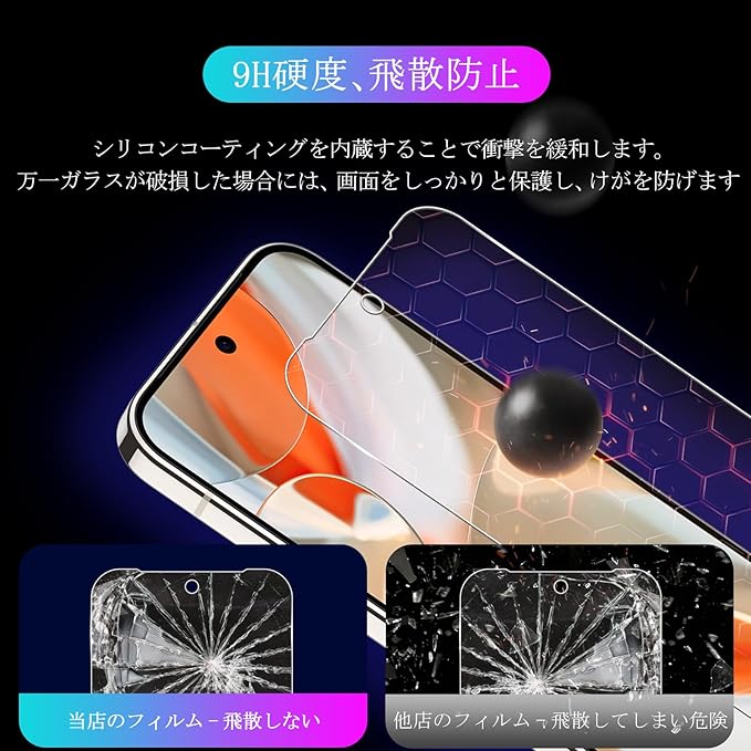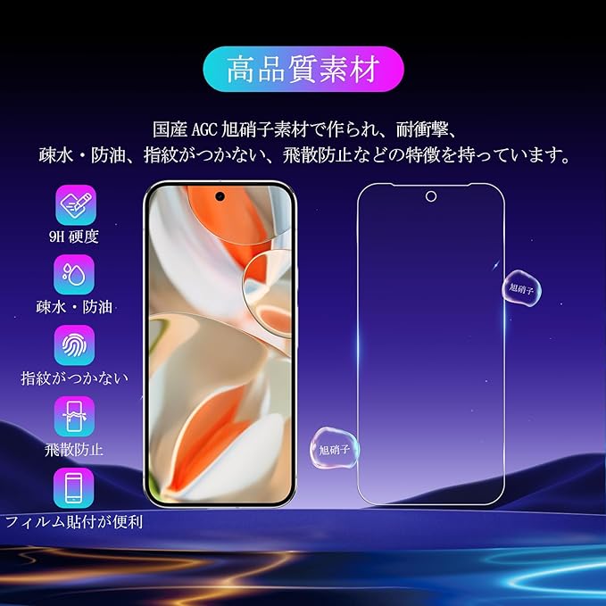 特徴 ①業界最高硬度9H、耐衝撃 ②スクラッチ防止、飛散防止③自動吸着、貼り付け簡単④気泡のない防止⑤撥水撥油、指紋防止⑥超高透明感⑦ケースに干渉しにくいサイズ⑧超耐久