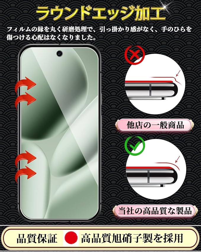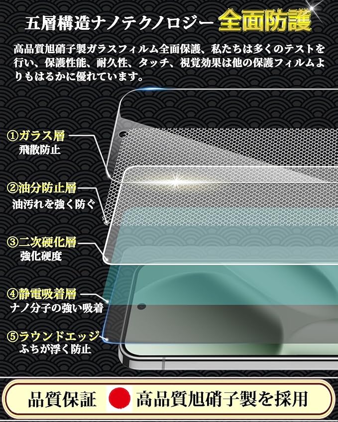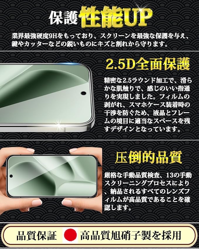 特徴 全面保護,9H表面硬度,飛散防止,防指紋,撥油コーティング,撥水剤,耐衝撃性,ラウンドエッジ,気泡なし,高透過率,簡単貼り付け