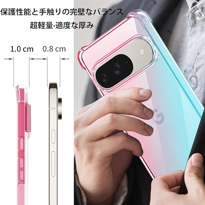 Google Pixel 9/9 Pro のデザインも損なわず薄型設計* ケースの薄さはわずか0.8MMで、Google Pixel 9/9 Pro の美しさそのままにさらに美しく。 取り付けやすい上にしっかりホールドするという特性をも兼ね備えています。