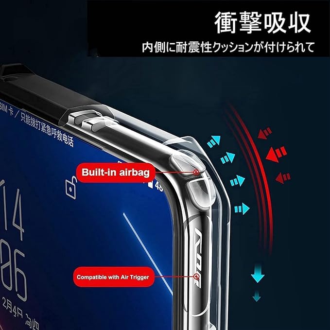 【四方から保護 】ケースの四角にエアーバッグ設計を採用しており、落下時の衝撃を吸収します。ケースはスクリーン及びカメラレンズより高い設計となり、スマホを全面保護します。