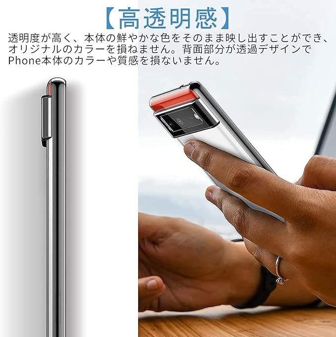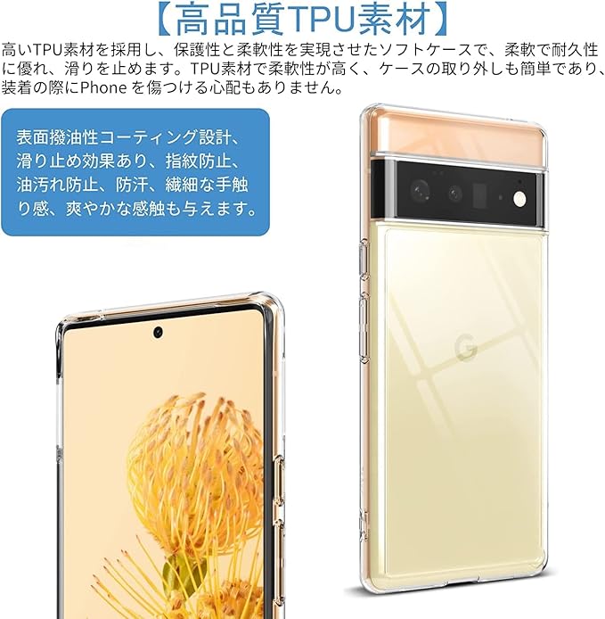 カラー:Google Pixel6 pro 高品質な素材 バンパー部分は柔軟性があり衝撃を吸収するTPU素材。擦り傷や磨耗に強く、埃や異物を寄せ付けにくい仕上がりです。簡単な装着も脱着も可能です。 丈夫で弾力がありますし、まるで何もつけてないような感じです。Google Pixel6 pro 本体のスリムさを損なわないで、手にしっかりフィットします。 各ホール部分は完璧に対応できる設計とされています。サイトボタンもびったり設計なので、敏感な操作感を続けます。 Google Pixel6 pro クリア TPU ケース 商品が届くまで 楽しみに待ってくださる お客様の元へ自信を持ってお届けしたい!!