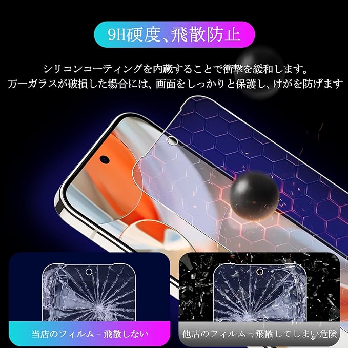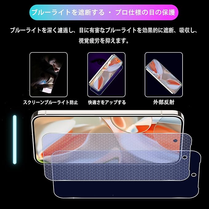 特徴 ①業界最高硬度9H、耐衝撃 ②目の疲れ軽減 ③スクラッチ防止、飛散防止④自動吸着、貼り付け簡単⑤気泡のない防止⑥撥水撥油、指紋防止⑦超高タッチ敏感度⑧超高透明感⑨ケースに干渉しにくいサイズ⑩超耐久