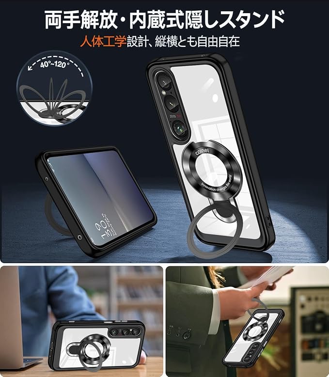 【リング付き・多機能スタンド】多機能スタンドとリング一体型の斬新なデザインです。縦置きでも横置きでも安定して支えられ、40 ~ 120 の間で多角度自由に調整できます。視聴に楽しみ、首や肩周りリラックス、指と腕の疲れ解消し,両手解放!