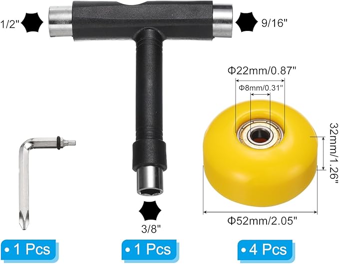 硬度:95A;ホイールサイズ:32 x 52mm / 1.26 x 2.05"(厚さ 外径);ベアリングサイズ:22 x 8mm / 0.87 x 0.31"(外径 内径);パッキングリスト:スケートボードホイール4個、オール インワンスケートツール1個、Phillipsヘッドレンチ1個