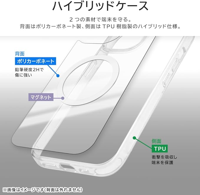 MagSafeなどの充電器やアクセサリーに対応。背面は傷に強い素材【鉛筆硬度2H】。衝撃をやわらげる四つ角のエアクッション構造。フチが画面やカメラより高いので傷付きにくい。