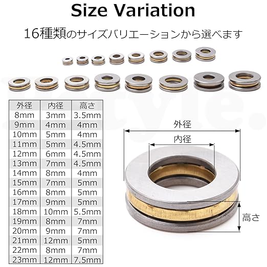 【仕様】 材質:ベアリングスチール。 バリエーション(外径):8mm 9mm 10mm 11mm 12mm 13mm 14mm 15mm 16mm 17mm 18mm 19mm 20mm 21mm 22mm 23mm。 バリエーション(内径):3mm 4mm 5mm 6mm 7mm 8mm 9mm 10mm 12mm。