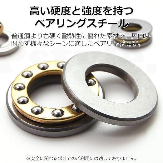 【高い硬度と強度を持つベアリングスチール】 普通鋼よりも硬く耐熱性に優れた素材で、屋内外問わず様々なシーンに適したベアリングです。 ※安全に関わる部分でのご利用には適しておりません。