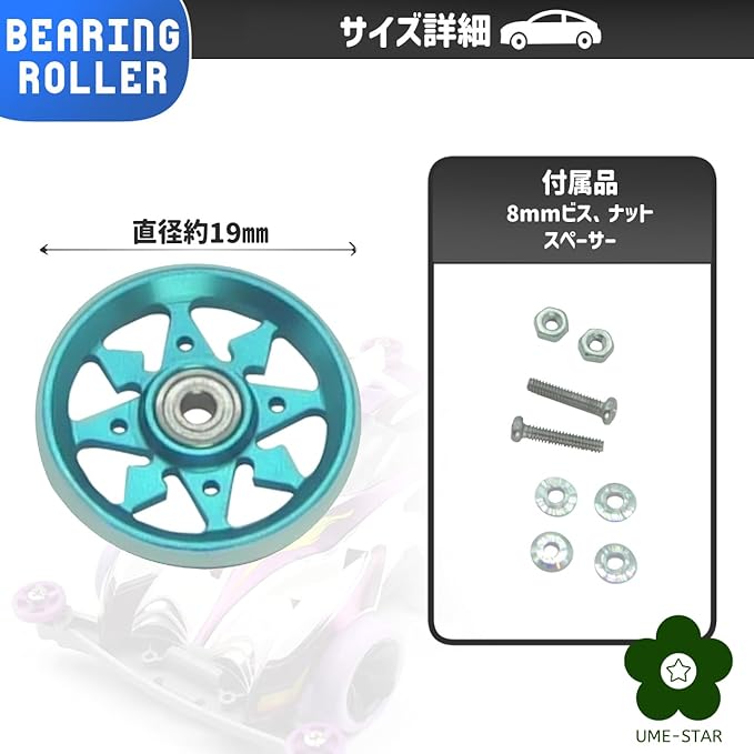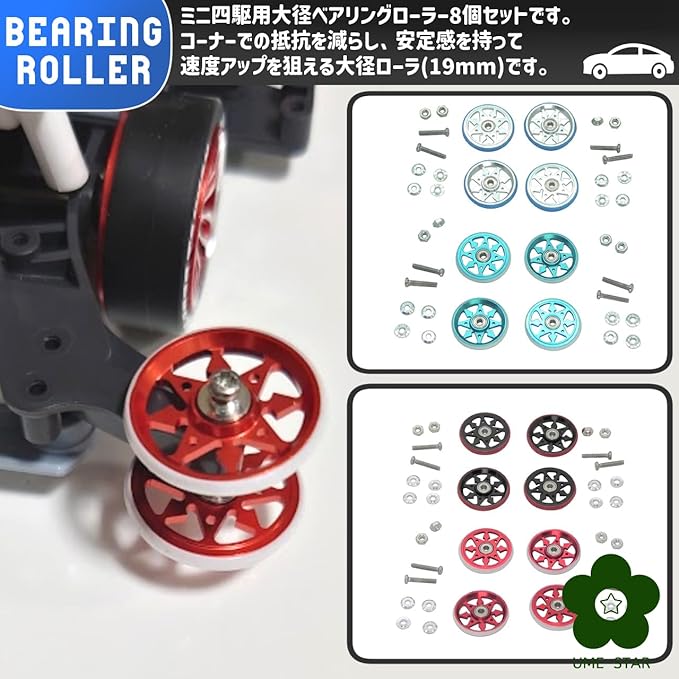 ミニ四駆用大径ベアリングローラー8個セットです。コーナーでの抵抗を減らし、安定感を持って速度アップを狙える大径ローラ(19mm)です。