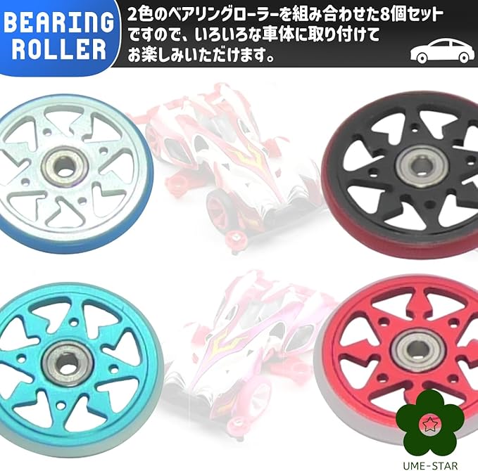 2色のベアリングローラーを組み合わせた8個セットですので、いろいろな車体に取り付けてお楽しみいただけます。