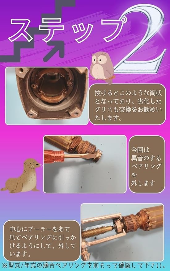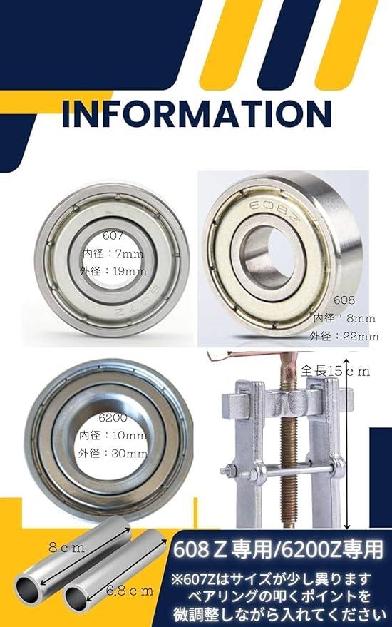 メンテナンス修理に使えるこちらのギヤプーラーとベアリングとベアリング入れ筒のセットは、モーターのベアリングによる錆 劣化 破損 欠損 摩耗など異音が発生した際にお使いいただけるベアリング交換セットです。轟音修理 家庭用ベアリング交換 モーターのベアリング交換 アングルグラインダーベアリング交換 電気ディスクグラインダーモーター修理など幅広くお使いいただけます。