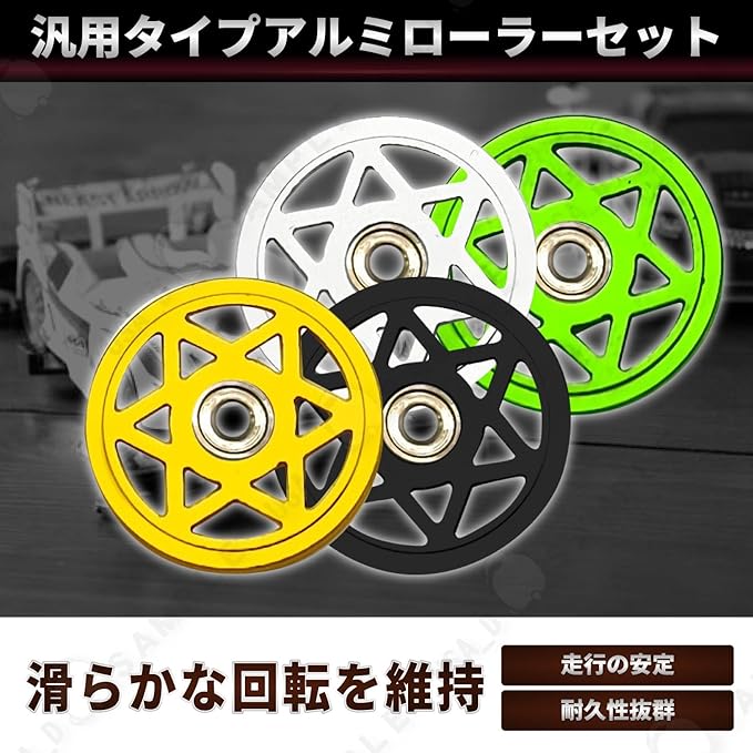 【 商品の概要と特長】 CNC精密加工によるアルミローラーセット(汎用品/19mm) この商品は、CNC加工された汎用タイプのアルミローラーセットです。ローラーサイズは直径19mmで、ミニ四駆のカスタム用ローラーパーツです。アルミ素材を使用しており、軽量化、耐久性、走行安定性に優れています。練習走行やセッティングの調整用として幅広く活用できます。