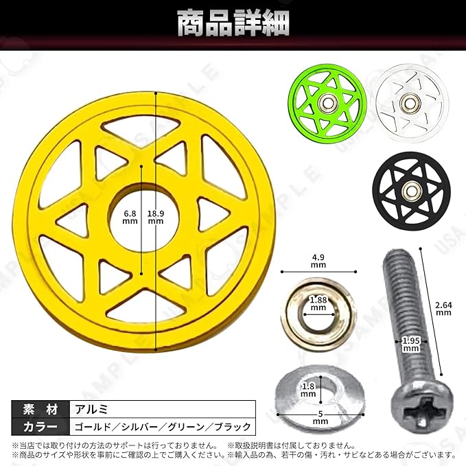 【カラーバリエーション】 シルバー 【セット内容】 アルミローラー4枚 取り付け用のネジ、ビス、ナット、ワッシャー(画像参照) 素材:アルミニウム合金 サイズ:メインパーツ19mm、他画像参照