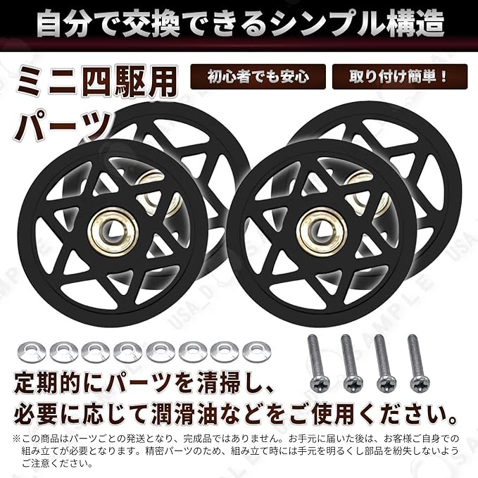 ※この商品はミニ四駆用のパーツです。ミニ四駆本体は含まれません。 ※取扱説明書は付属しておりません。 ※輸入品のため多少の傷やバリ、色はげなどがある場合がございますのでご了承ください。 ※アルミ製の精密部品を含むため、取扱いには十分ご注意ください。 ※走行前には必ず各パーツの取り付けが正しく行われているかをご確認いただき、緩みやズレがないかチェックしてください。 ※小さな部品を含みますので、小さなお子様の手の届かない場所で保管・作業をお願いします。