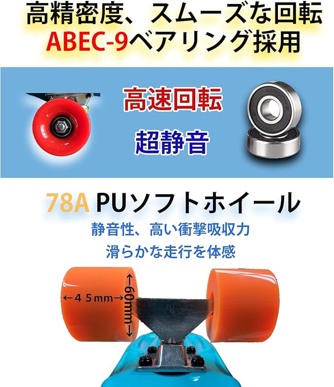 ホイールサイズ:60x45㎜、硬度78Aの柔らかいPUホイールを採用、多少粗い路面の状態でも安定した走行ができ、初心者に最も最適なホイールです。