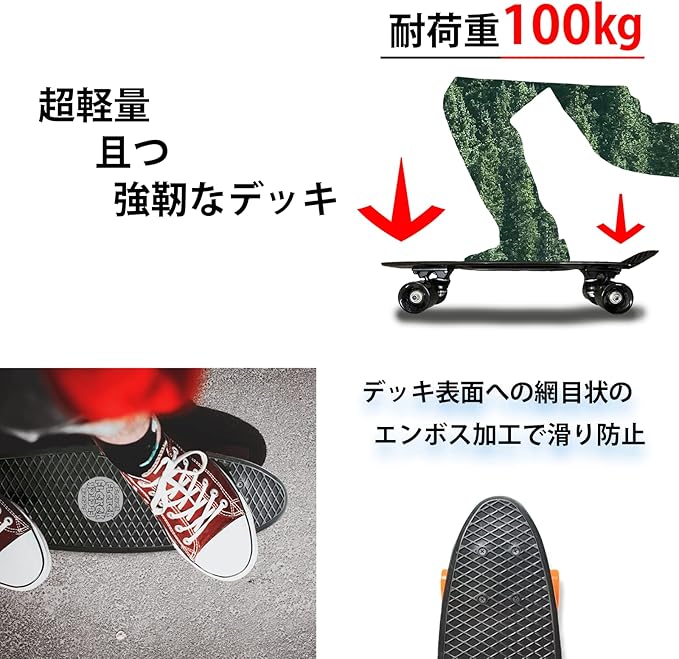 最大耐荷重100kgと耐久性にも優れ、子供から大人まで安心して使えるスケートボードです。