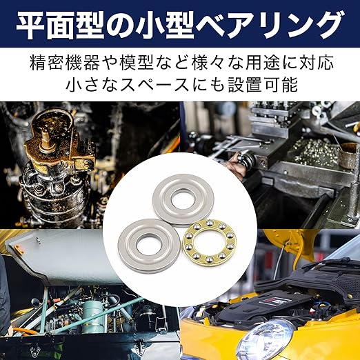 平面型の小型スラストボールベアリング:このスラストボールベアリングは、平面型の小型サイズです。精密機器や模型、自動車部品など様々な用途に対応しています。コンパクトながらも高い性能と安定した動作を実現する設計です。小さなスペースにも設置可能で、使い勝手に優れています。