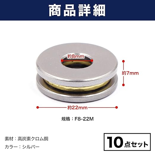 セット内容:10点セット 規格:F8-22M(約8mm 22mm 7mm) 素材:高炭素クロム鋼 カラー:シルバー ※モニターの環境等により、色の見え方に若干差が生じる場合がございます。