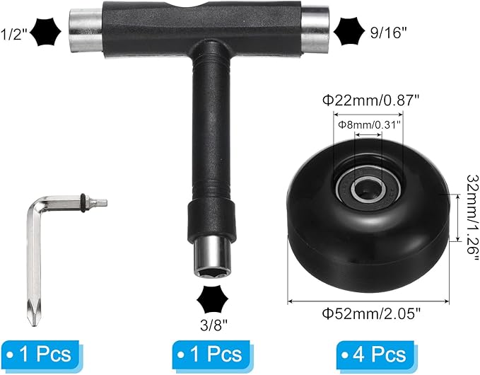 パッキングリスト:スケートボードホイール4個、オール インワンスケートツール1個、Phillipsヘッドレンチ1個