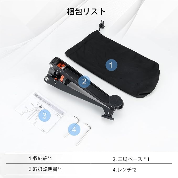 安定したサポート - 三脚ベースは高強度アルミニウム合金製で耐久性に優れています。脚の長さは21cmで、延長された三脚脚により安定性が向上しています。耐荷重10kg(最低伸長位置)