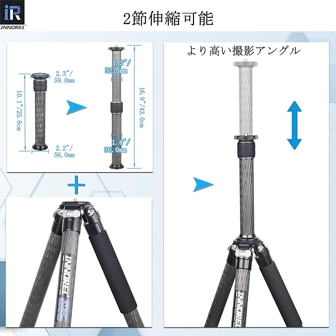 【2節伸縮可能】2節伸縮デザインです。伸縮高度は25.6cmから43cmまであります。更にカメラの撮影高度を高めることができます。
